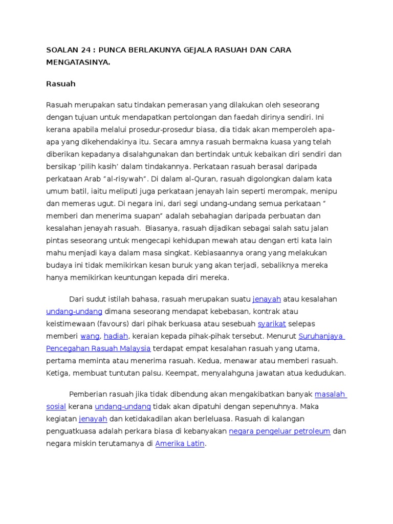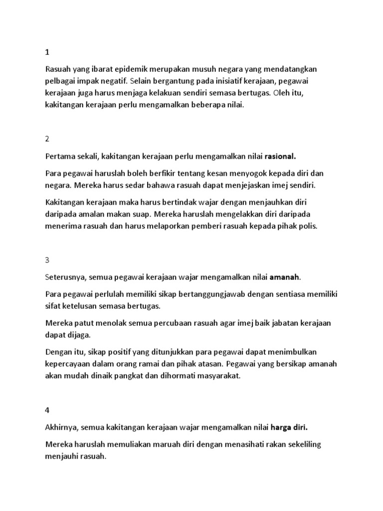 Kursus Pengukuhan Dan Pemantapan Integriti Perkhidmatan Awam Pdf Free Download from docplayer.info Kegiatan rasuah semakin berleluasa di negara kita dan menjadi ancaman kepada imej negara. Masyarakat di negara ini akan menjadi porak peranda, berpecah belah dan tidak bersatu padu. Seseorang itu tidak boleh maju, selagi mana pintu rasuah terbuka luas. Keruntuhan akhlak akan menyebabkan masyarakat menjadi hilang punca dan pertimbangan. Sistem dalam masyarakat saling berhubungan antara satu manusia dengan manusia lainnya yang membentuk. Perbincangan mengenai rasuah adalah penting kerana kegiatan rasuah akan melumpuhkan fungsi perjalanan sesuatu organisasi. Oleh itu, segala usaha mesti disatukan oleh masyarakat, negara dan individu untuk mengatasinya. Khairul azhar idris (2005) menyatakan bahawa pada hakikatnya gejala rasuah dilihat sebagai satu jalan pintas dan mudah bagi.